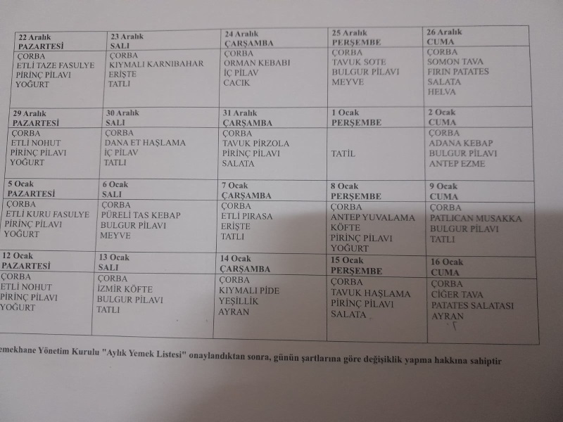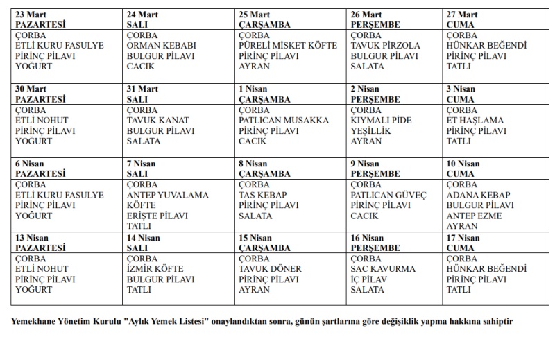 Aylık Yemek Listesi